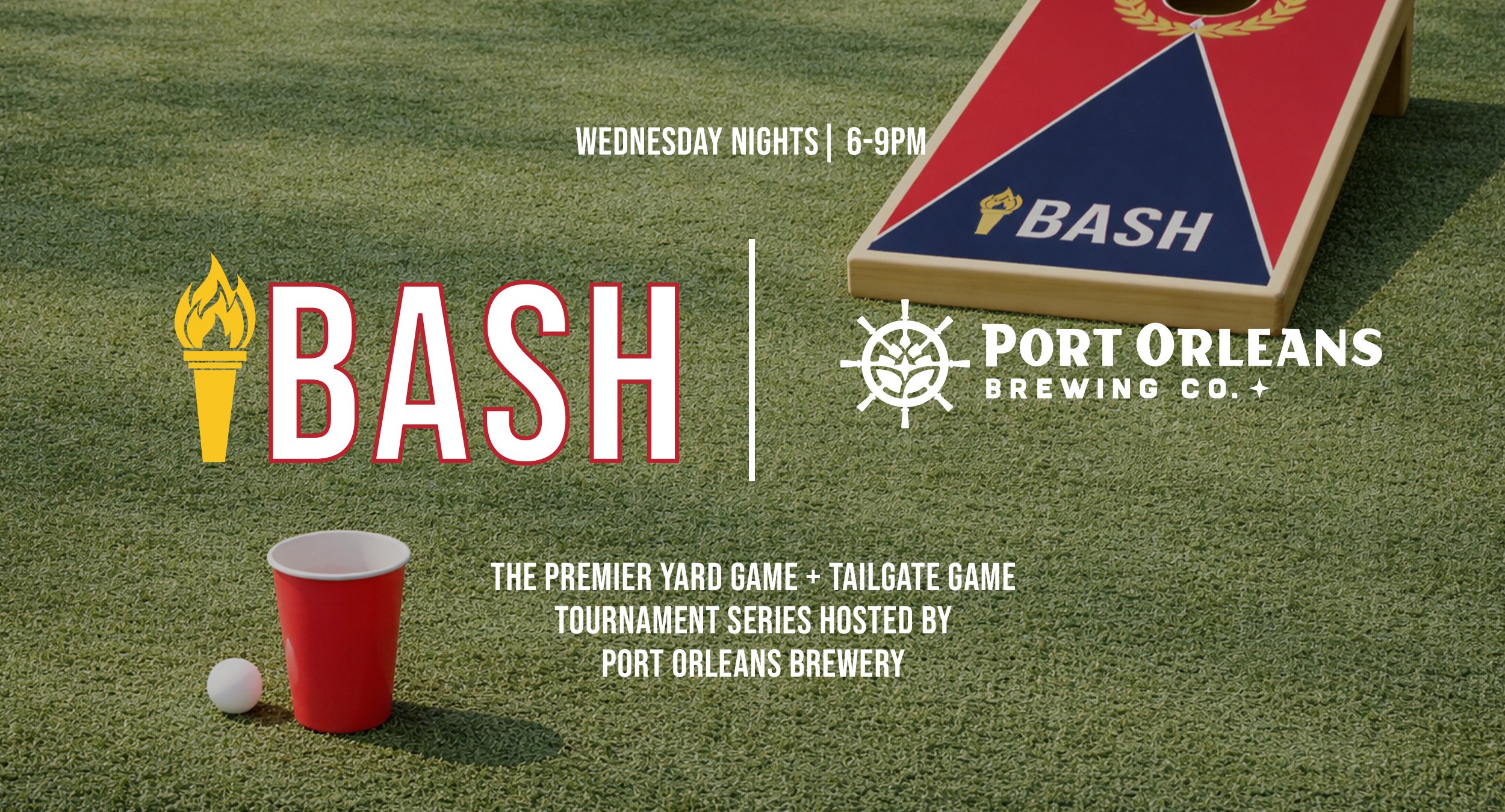 Join us at Port Orleans Brewing Co. on Wednesday nights from 6–9PM for BASH SZN—an 8-week partnership tournament packed with backyard games, team challenges, cold drinks, and competitive energy.